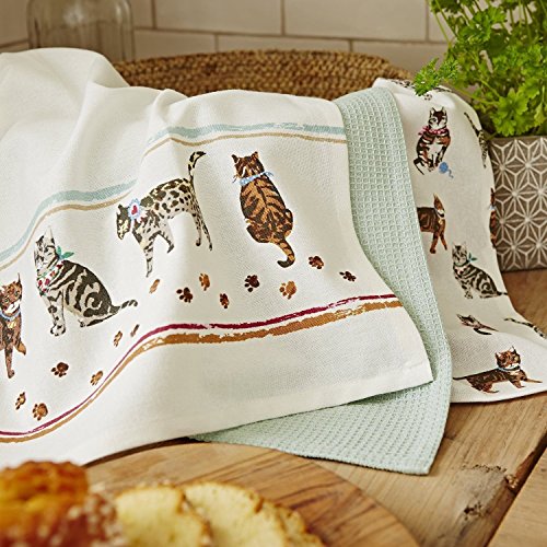 - Set contains 1 border panel print tea towel, 1 pale green waffle towel and 1 cats on parade all over print
