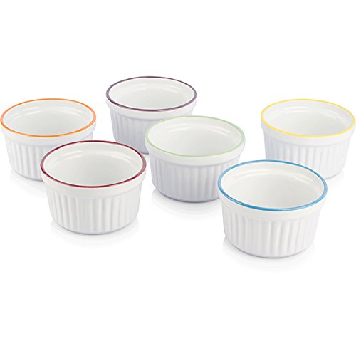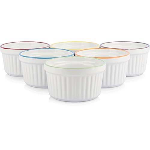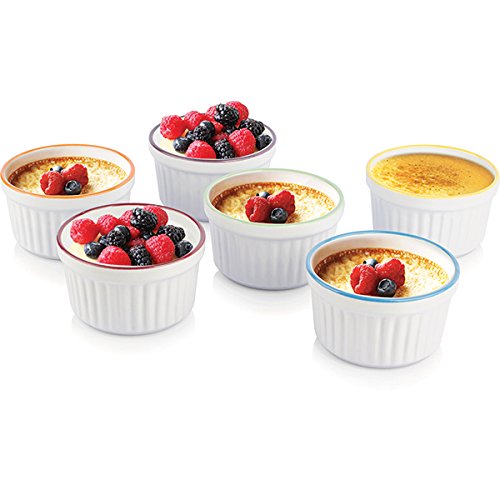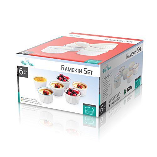Studio : Uno Casa Publisher : Uno Casa Product Description Creme brulee is a dessert that never fails to please when it's on the menu, but if you want to serve it in the most attractive and delicious way possible, you need to have the right ramekin dishes in your collection! The Uno Casa Stoneware Creme Brulee Ramekin Baking Dish Set will allow you to serve the classic dessert and other tasty foods in the best possible way, so you can wow your guests with your skills! The Uno Casa Stoneware Creme Brulee Ramekin Baking Dish Set gives you a total of six creme brulee ramekins made out of heavy-duty stoneware materials. Measuring 3.75 inches by 2 inches in size, our baking dishes are 5 oz ramekins and have a traditional look with a molded lip and a fluted texture around the sides. Each creme brulee set includes a white ramekin with colored rims and will add color to your table. While the Uno Casa Stoneware Creme Brulee Ramekin Baking Dish Set gives you the best creme brulee dishes that money can buy, it's not just a creme brulee set. You can use these ramekins for: - Souffles - Quiche - Casseroles - Individual desserts - Ice cream - Fresh fruit - Many other desserts, sides mini entrees The Uno Casa Stoneware Creme Brulee Ramekin Baking Dish Set is the best choice of ramekin dishes for any type of cooking or baking because it's: - Dishwasher safe for easy cleaning - Temperature safe for use in freezer, oven, microwave fridge - Food safe FDA approved - Ultra durable due to stoneware construction - Stack-able for simple storage Present dessert in a way that will have everyone feel like they're dining at the finest French restaurant! Choose the best creme brulee ramekins on Amazon! Order the Uno Casa Stoneware Creme Brulee Ramekin Baking Dish Set now. 0