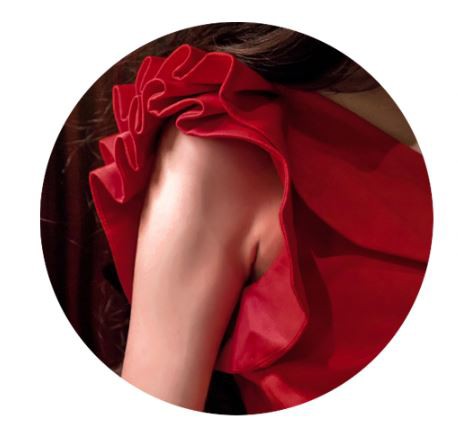 胸元についたフリルでシンプルな美しさの中に華やかさもプラス。