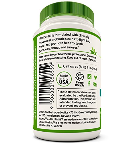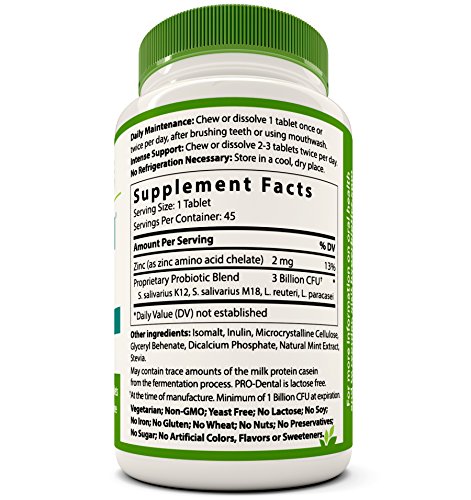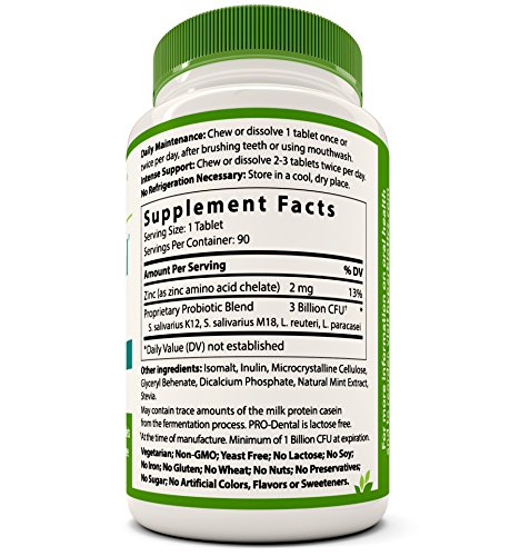 -. Title : PRO-Dental: Probiotics for Oral & Dental Health - Targets Bad Breath at its Source - Top Oral Probiotic Strains Including S. salivarius BLIS K12 & BLIS M18 - Sugar Free (Chewable) (90 Tablets)