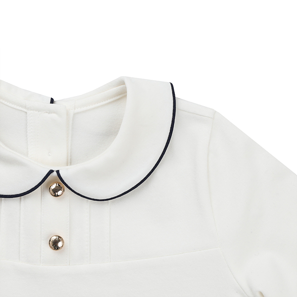 둥근카라장식이 여성스러움을 돋보이게 하며 골드버튼장식이 포인트가 되는 상품입니다.