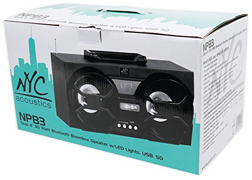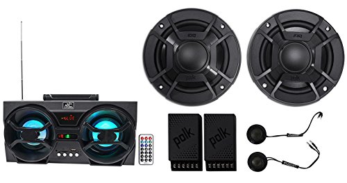 -. Feature : (2) Polk Audio DB5252 5.25" 600w Component Car/Marine/ATV/Motorcycle Speakers. High performance audio upgrade that delivers signature quality sound that goes beyond OEM factory systems. Marine certified with IP65 rating (water- and dirt-resistant) and tested for salt-fog, UV and humidity. Polypropylene and UV tolerant cone with waterproof inner and outer surrounds. / Simple drop-in installation for any vehicle including cars, boats, ATVs-you name it. Zero tweeter protrusion and reduced mounting depth for a precise fit. Dynamic Balance technology offers a rich, clean, full-range sound. ¾" & ½', 20mm & 13mm tweeter and midrange ensures clear, balanced mids and highs. 100 Watts at Continuous Power; 300 Watts at Peak Power / NYC Acoustics Dual 4" 30 Watt Bluetooth Boombox Speaker w/LED Lights, USB, SD. 30 watts Peak power. 10 watts RMS power. Battery charges with included USB cable. Mini USB auxiliary input with included cable to connect smartphones or MP3 players. Built-in AM/FM radio tuner with antenna for amazing reception. 1200 mAH battery supports up to 6 hours of playback!. LED on each woofer that blinks to the beat of the music. / Playback time at normal volume: 5 - 6 hours. Playback time at high volume: 3 - 4 hours. Charge time: 3-4 Hours. Extremely loud, powerful, and compact. Perfect for camping, beach, bedroom, kitchen and many other applications. Bluetooth version. 2.1 with EDR (Enhanced Data Rate). A2DP Bluetooth audio streaming 33 foot max Bluetooth range. Automatically remembers and syncs with previously synced devices. / Can control next song, pause, and play from the Bluetooth speaker. Compatible with any Bluetooth devices such as iPad, iPhone, Laptops, Android phone, other cell phones, iPods, other Bluetooth MP3 Players. Natural sound with enhanced bass response. Distortion: Less than 1 %. Signal to noise ratio: 80dB. Thick wood speaker enclosure for great sound and extreme durability. Frequency Response: 100HZ - 20KHZ. LED Display screen.