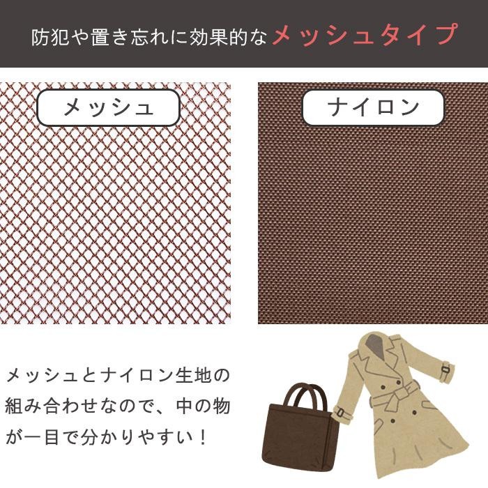 メッシュとナイロン生地を組み合わせたシンプルなデザインの手荷物入れです。中の物が一目で分かるので防犯や置き忘れに効果的。奥行き20cmで場所をとらずに置けるスリムタイプなので、カウンター席の間やサロンなどで1人用としてお使いになるのにも便利なサイズです。 |