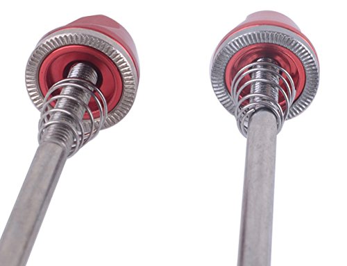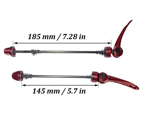 Road Mountain Bicycle parts are made of Aluminum alloy, durable and practical for most bikes The short release lever for front wheel, quick release: approx.145mm / 5.7 in The long release lever for the rear wheel, quick release: approx. 195mm / 7.68 in Usually the axels fit 20" 22" 24" 26" 28" bike, work on a 6 7 8 speed road bike Weight: approx. 120g / 4.23oz Color:black