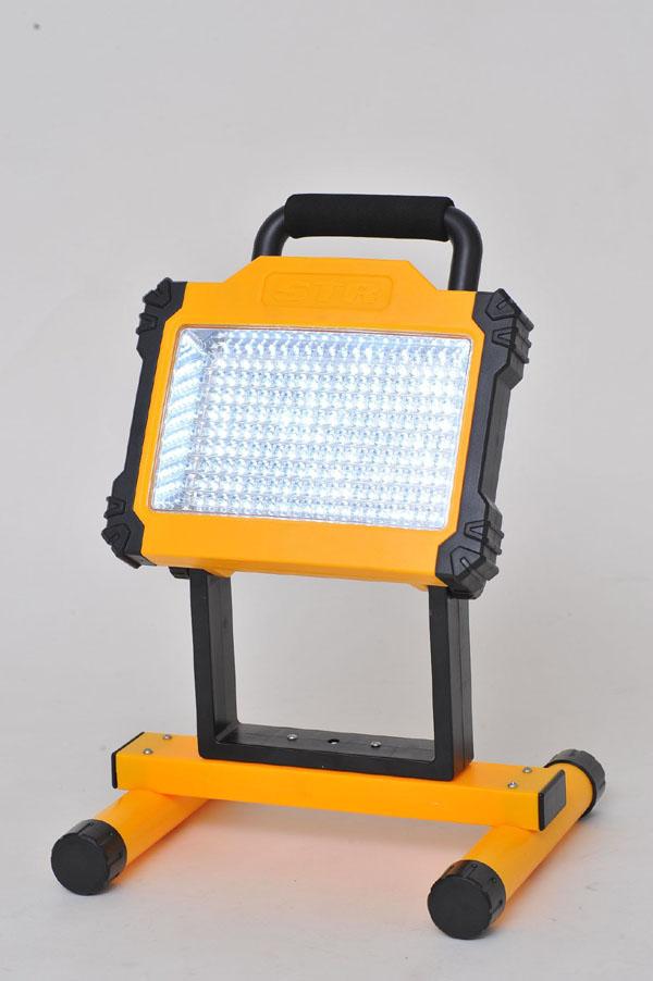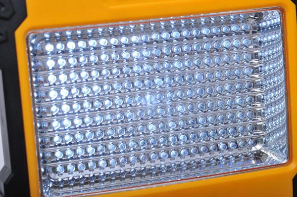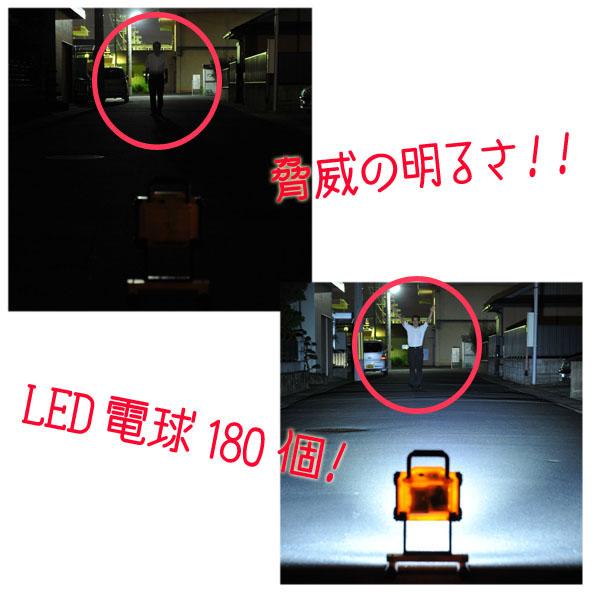 | LED180個を搭載し驚きの明るさを実現した充電式ポータブル投光器。充電式で電気のない所でもご使用頂けます。充電は、ご家庭の100V電源だけでなく、車のシガーソケットからも充電できます。スタンド式なので地面や台などにおいて使用でき、両手が使えるので、作業効率もはかどります。夜間での作業や停電時の照明として重宝します。充電時間約8時間で、約3時間使用できます。(目安:条件により異なります) |