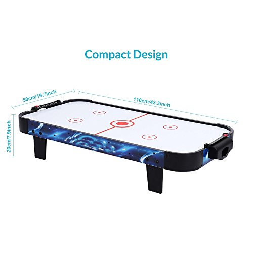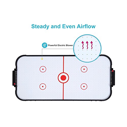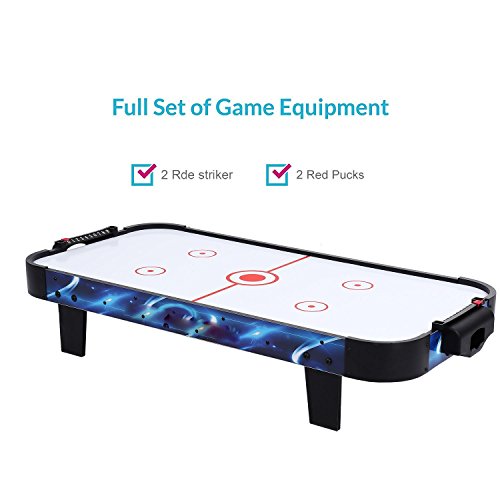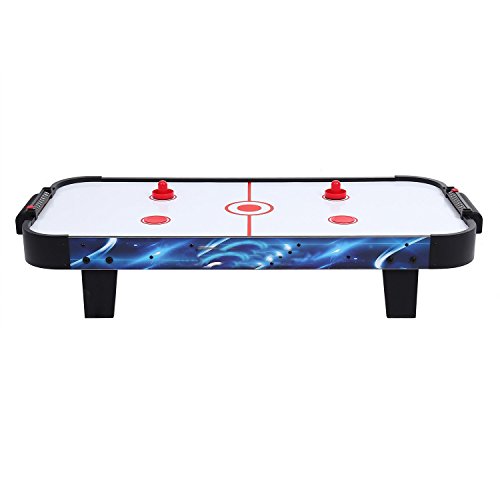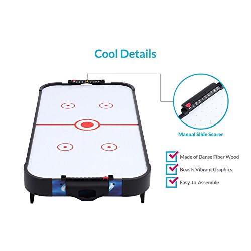 Product Feature: 40inch tabletop air hockey model, great for younger kids who want to enjoy the game of air hockey Sturdy MDF hardwood frair-powered motorme sits on any table type Air-powered motor ABS puck catcher allows for quick puck return Includes 2 strikers and 2 pucks