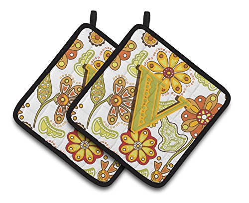 Caroline's Treasures Letter V Floral Mustard & green Pair of Pot Holders CJ2003-VPTHD, 7.5HX7.5W, Multicolor