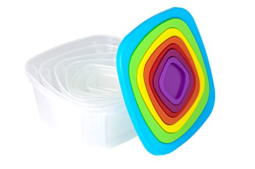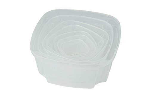Set includes: 9 x 9 x 4 in = 3 Quarts; 7 x 7 x 3.5 in = 3 Pints; 6 x 6 x 3 in = 1 Quart; 5 x 5 x 2.5 in = 1 Pint; 4.5 x 4.5 x 2 in = 1 Cup; 3.5 x 3.5 x 2 in = 7 Oz.; 3 x 3 x 2 in = 3 fl. Oz.;