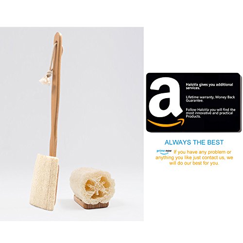 HaloVa Bath Brush, Loofah Shower Body Brush with Long Wooden Handle, Back Scrubber for Wet Dry Skin Brushing, Massaging, Detachable Head