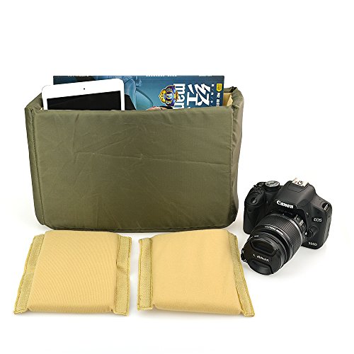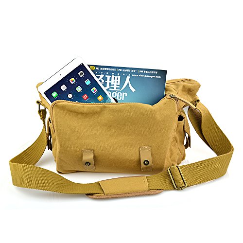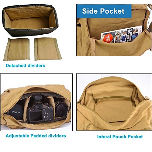 BESTEK Canvas Camera Shoulder Bag is customized with all SLR DSLR and its accessories, especially a large front pocket for iPad and magazine, and its fully padded insert not only separates DSLR from accessories but offers a shock-proof protection. This camera messenger bag is well-made of waterproof canvas material, has great compartments for various things, comfortable on the go, casual, and practical for travelling, hiking, photographing, and other outdoor activities. When you fetch the separate insert out, this photography bag becomes so large and roomy, casual messenger bag even as a school bag as you like.