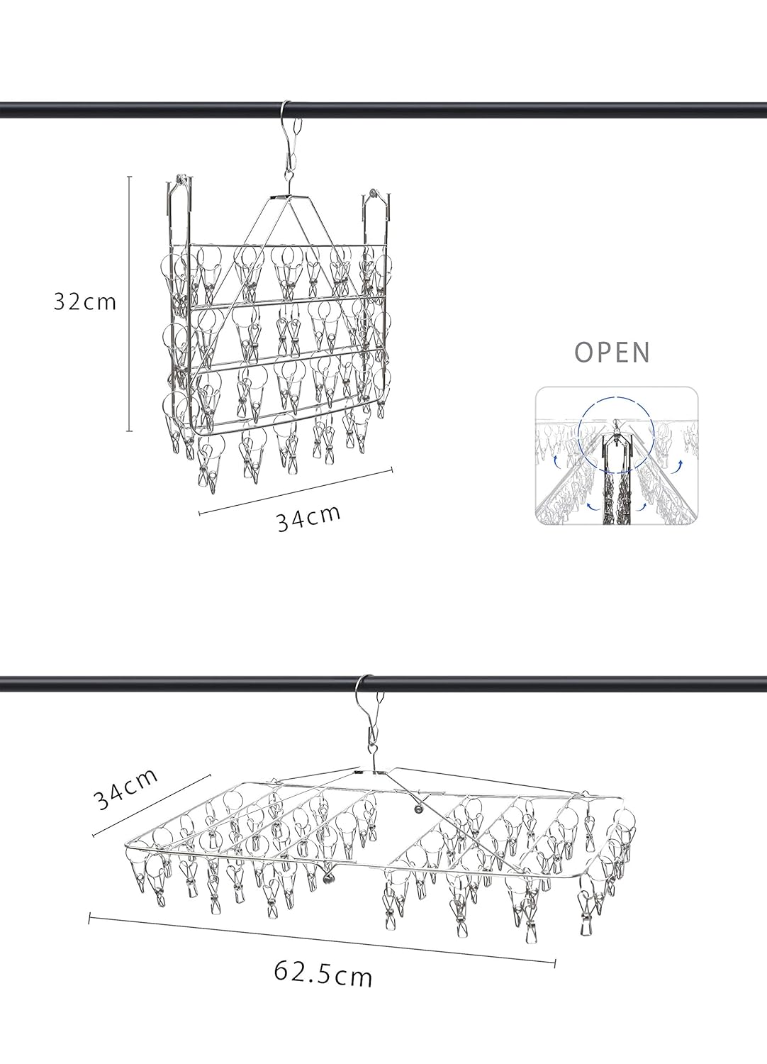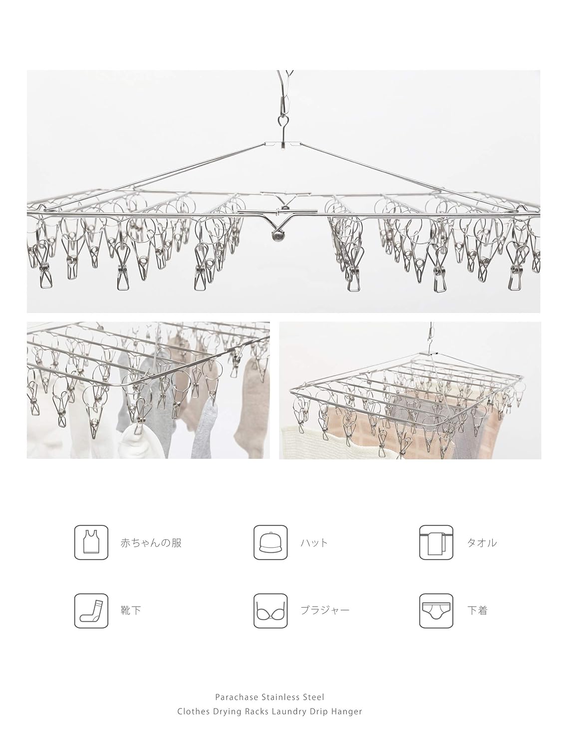 【多いピンチ数・多用途】52ピンチなので、たくさん干せます。ピンチ1つのはさむ力が強いので、風が強い日でも衣類を落とさずに固定しておくことができます。ハ ンカチやタオル、スカート、マフラー、帽子、靴下、ブラジャー、下着、赤ちゃんの服などの小物衣類に最適です。また、ピンチ同士の間隔を広くとって配列している ので、風通しがよく早く乾きますし、下着と靴下を分けて干すことができて、衛生面でも非常に効果的です。