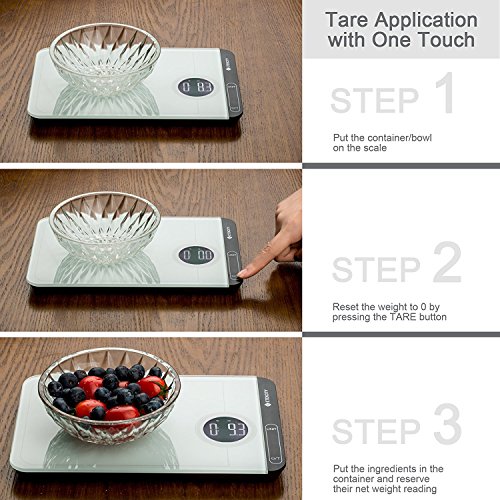 Benutzerfreundlich: Leicht umschaltbar zwischen einstellbaren Einheiten g / fl.oz / lb: oz / ml / oz; Der genaue Tara-Knopf lasst Sie das Gewicht eines Behalters vom Gesamtgewicht abziehen, damit Sie das Nettogewicht des Inhalts leicht berechnen konnen, verwendbar fur beide trockene Bestandteile und Flussigkeiten; Ausgestattet mit Anti-Rutsch-Polsterung zur Stabilisierung und leicht zu reinigen Glasoberflache