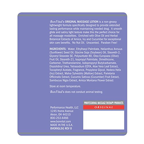 Studio : TheraBand Publisher : TheraBand Binding : Misc. Product Description Bon Vital is the #1 preferred brand of massage therapists focused on professional quality products. Its original family of cremes, oils, gels, and lotions provides the perfect foundation for relaxing massages of all modalities and techniques that heals dry skin and locks in moisture. The Original line of water dispersible formulas is ideal for blending with essential oils to create the ultimate aromatherapy massage experience. 0