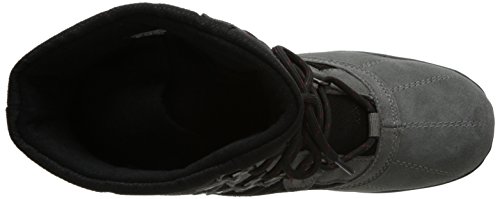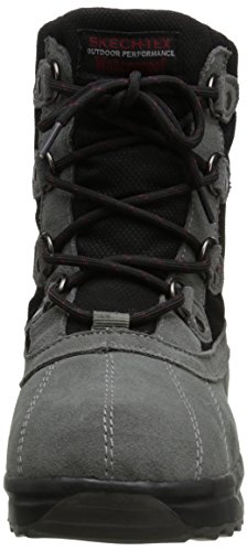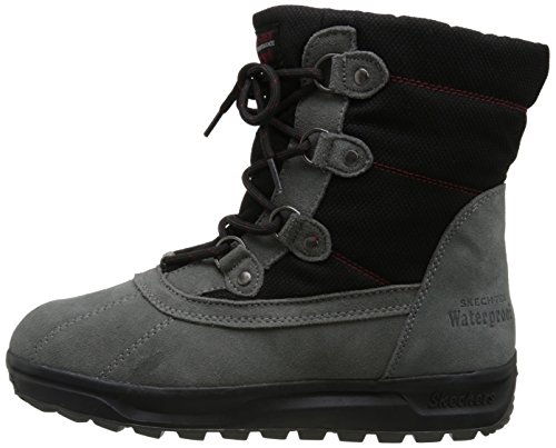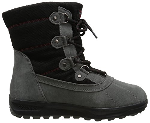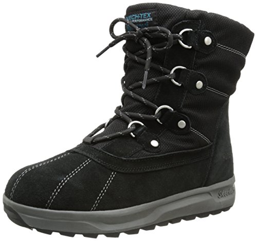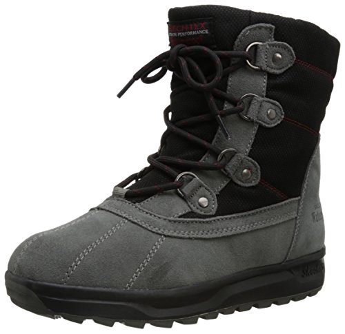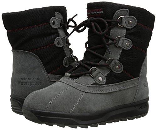 Brave any conditions in style wearing the SKECHERS Storm Cloud - Cumulus boot. Waterproof suede and ripstop fabric upper in a slip on mid calf height waterproof insulated cold weather boot with lace up front and stitching accents. Laced front with metal D-rings and rivet detail. 6 3/4 inch shaft height. 4 1/2 inch top width for a 13 1/2 inch top circumference. Seam sealed waterproof interior. Soft lightweight Thinsulate® 200g insulation. Weather tested to -25 F / -30 C. Soft shearling topped footbed. Memory Foam removable cushioned comfort insole. Shock absorbing durable midsole. Long wearing, heavy duty high traction rubber outsole.