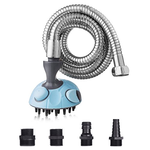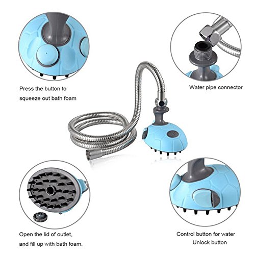 -. Feature : This is a multi-functional shower sprayer for pets indoors and outdoor use / Multifunctional: washing, massaging ,brushing and grooming make your pets enjoy the shower / Ergonomically designed: all features can be used with a single hand / Long hose for reach, enough water pressure to rinse your dog thoroughly with no extra suds while drying him off. / Universal connector is suitable for both indoor & outdoor use makes the shower can be taken in bathroom, kitchen, garden, everywhere if you have running water, easily and quickly dealing with the trouble of pet bathing.