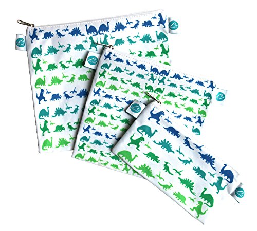Reusable Sandwich & Snack Bags by MAKE WAVES – Set of 3 Designer Cotton – Eco Friendly, Washable, with Zipper – Mountain or Dinosaur Theme (Dinosaurs)