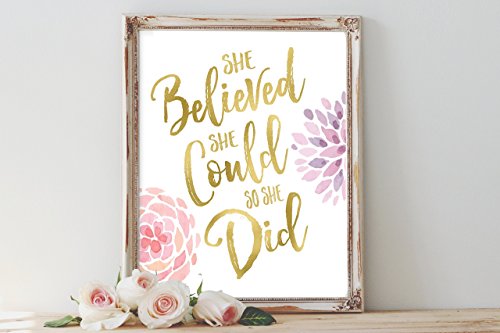 Fall in love with this Inspirational gold foil and watercolor art print. "She Believed She Could So She Did" quote is printed in luxe gold foil on extra heavy pure white cardstock paper. Watercolor flower artwork printed with premium ink and looks hand-painted. The gold foil printing process does not work on canvas or thick art board so please note that this listing is for the CARDSTOCK PRINT ONLY and NO FRAME is included with purchase. All prints are sealed in cellophane with double-weight cardboard backing and placed in a rigid photo-mailer envelope then boxed again. Your print will arrive flat and safe or we will replace it. Gift wrap is available during check-out.