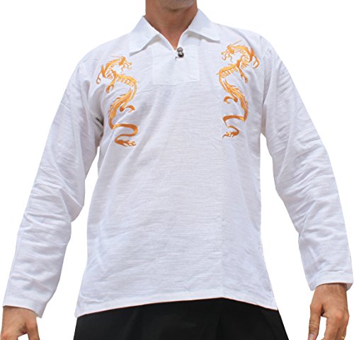 RaanPahMuang Poets Collar Cotton Shirt Chinese Double Dragon Embroidered Long Sleeve