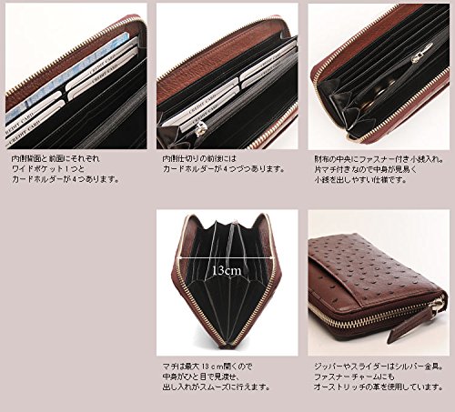 -. Feature : 柔らかく丈夫な革のオーストリッチを使ったラウンドファスナー長財布。 クロコダイルと並ぶ高級皮革、オーストリッチの長財布。 ぐるりと「コの字」に開くラウンドファスナー式で、お札や小銭、カード類はもちろん、通帳やパスポートまで収納可能。 / ■サイズ 横20cm/縦10cm/厚み(約)2.5cm 【素材】オーストリッチ(ハーフポイント)/内側:合皮 【仕様】 内側:カードホルダー×16 /札入れ×3/ファスナー付ポケット×1/ワイドポケット×2 外側:ワイドポケット×1/ファスナーポケット×1 / 金具カラー/シルバー / (No. 309014 r )
