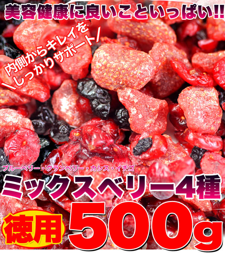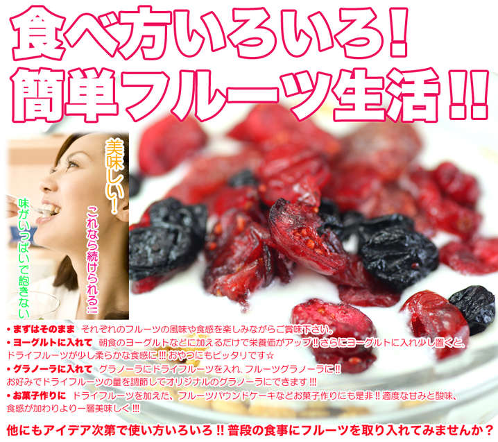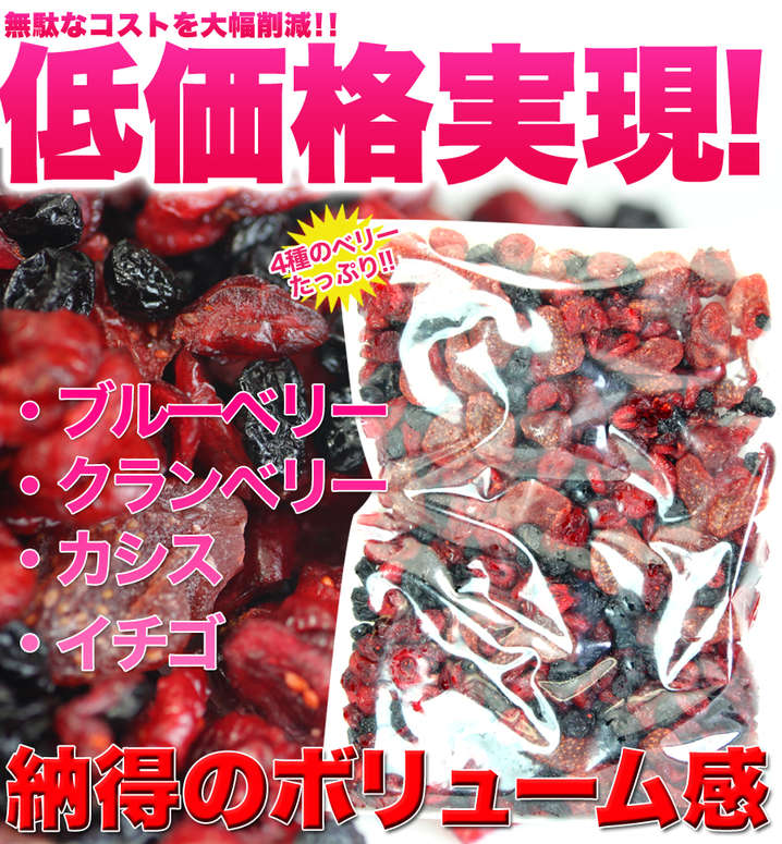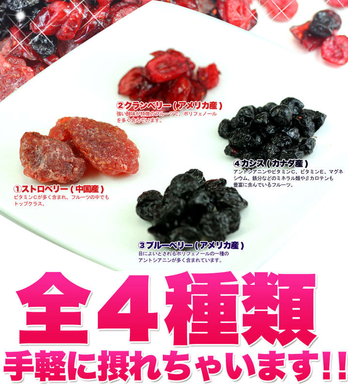 ●原材料名:クランベリー(アメリカ)、イチゴ(中国)、ブルーベリー(アメリカ)、カシス(カナダ)、砂糖、果糖、コーンシロップ、サンフラワーオイル、クエン酸、リンゴ酸、漂白剤(亜硫酸塩)、着色料(赤40)、香料