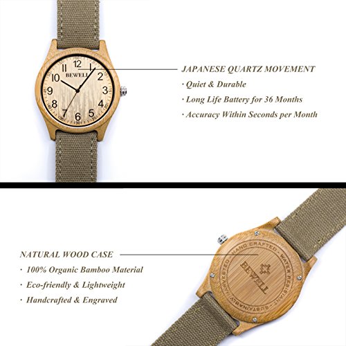 Brand, Seller, or Collection Name:BEWELL Model number:124B-BA-ZS Part Number:124B-BA-ZS Item Shape:Round Dial window material type:Hardlex Display Type:Analog Clasp:Buckle Case material:Bamboo Case diameter:4.50 centimeters Case Thickness:1 centimeters Band Material:Canvas Band length:Men's Standard Band width:2 centimeters Band Color:Green Dial color:Beige Bezel material:Bamboo Special features:Canvas Strap Movement:Japanese quartz