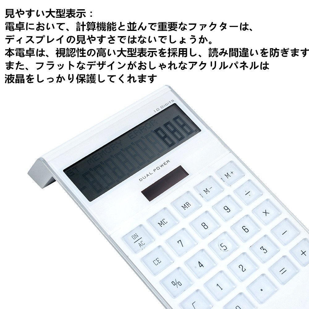 見やすい大型表示:電卓において、計算機能と並んで重要なファクターは、ディスプレイの見やすさではないでしょうか。本電卓は、視認性の高い大型表示を採用し、読み間違いを防ぎます。また、フラットなデザインがおしゃれなアクリルパネルは液晶をしっかり保護してくれます