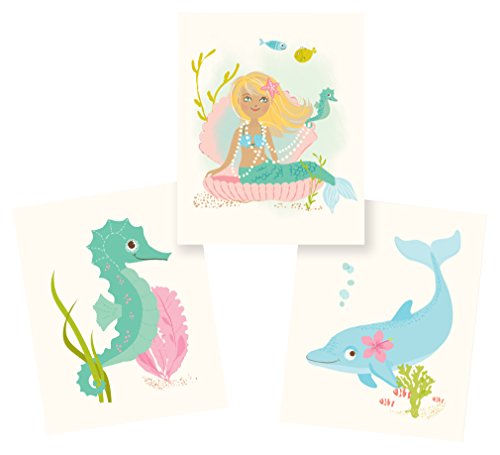 Sea Urchin Studio Ocean Wall Art for Girls, Blonde Mermaid-Seahorse-Dolphin 3 Print Set, Each 8" x 10