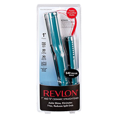 ReleaseDate : 2016-07-20 Studio : vidal sassoon Publisher : vidal sassoon Binding : Misc. Product Description The Revlon Straightener Bonus Pack includes both a 1 inch and 1/2 inch Teal Ceramic Straightener. The 1 inch tourmaline ceramic straightener provides high even heat and maximum hair conditioning ions for shiny, healthier looking hair, offers 30 heat settings, automatic shut off and a tangle free swivel cord. The 1/2 inch tourmaline ceramic travel pro mini straightener is perfect for touch-ups, travel or the gym. Both have 30 second fast heat up, instant heat recovery, On/Off” Switch w/ “On” Indicator Light. 0