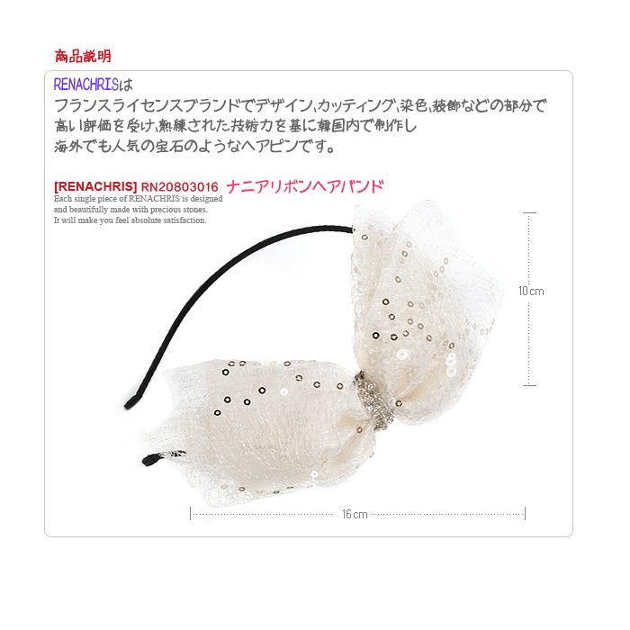 ・サイズ:リボン約16×10cm・素材:ファブリック、レース、スパンコール、ビーズ、カチューシャ・メーカー:レナクリス***ビーズ、スパングル、レース使いが華やかさを添えたリボンカチュー    シャ★     ふんわりとしたボリューム感でレディーな印象*:;;;:*☆***