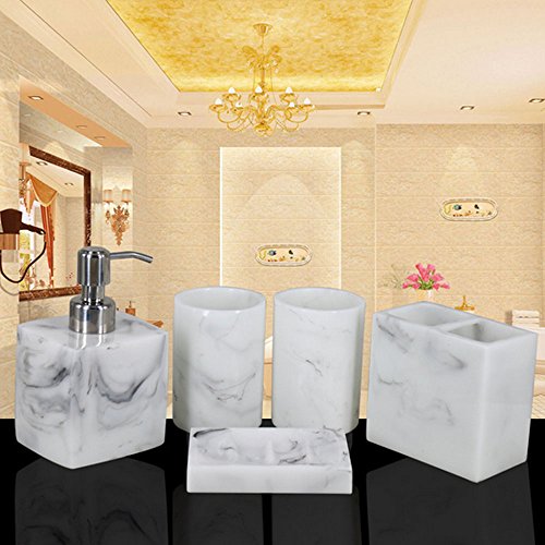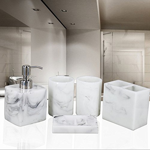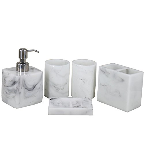 Contemporary deluxe 5 piece bathroom accessory set includes 1 round soap dish, 1 lotion/soap pump dispenser, 1 toothbrush holder (holds up to 4 toothbrushes), and 2 tumbler.