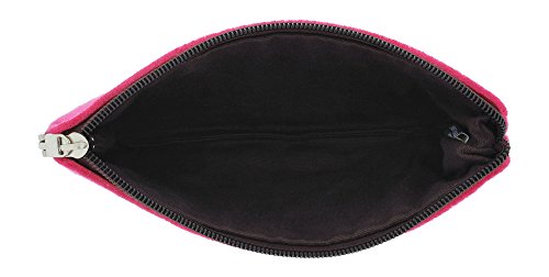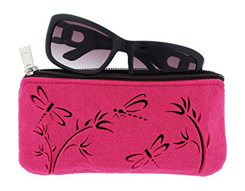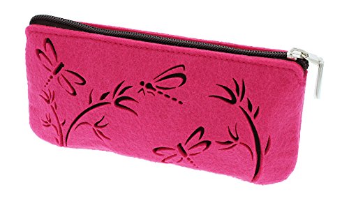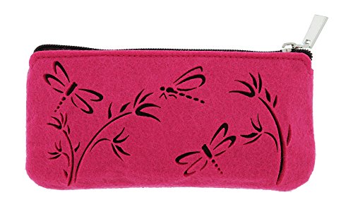 Pink felt pouch is laser cut with a charming nature scene in dark brown featuring tall reeds and several dragonflies flitting about