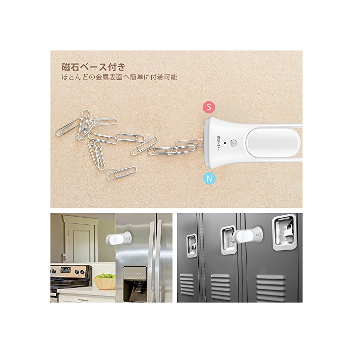 【설치 간단】콤팩트에,코드도 없기 때문에 어디에나 쓰입니다.또한저부에 있는 자석에 의해 서가,캐비넷,냉장고 등 대부분의 금속부에 설치가 가능.차나 오토바이의 점검 시나 작업 시에도 대단히 도움이 됩니다.저부는 평탄하게 되어 굽히고, 확실히 설치되기 때문에 안심입니다.