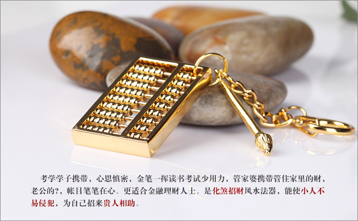 Abacus said carefully, saying "the treasury is full, put the abacus." There are people who want to save often feel financial drain and reserve money, this thinking is to prevent the leakage of wealth. Previously businessman to build gold abacus, hanging in the chest represents the number of sperm. After the opening blessing handle, carry enhance their fortune, mid Cai. Exam school students carry, careful thought, waved a gold pen reading exam little hard, manage and carry fiscal housekeeper at home, her husband's money, accounts pen in mind. Financial planning is more suitable person. Lucky Feng Shui is Huasha instruments, the villain is not easy to make violations provoke honored for their help. This adder can carry (or hang on the bag and keys on the phone), can also be placed on the desk.