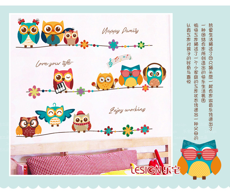 创意卡通儿童房间卧室床头装饰品可爱猫头鹰贴画幼儿园自粘墙贴纸