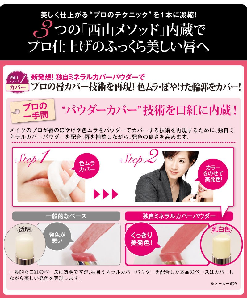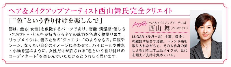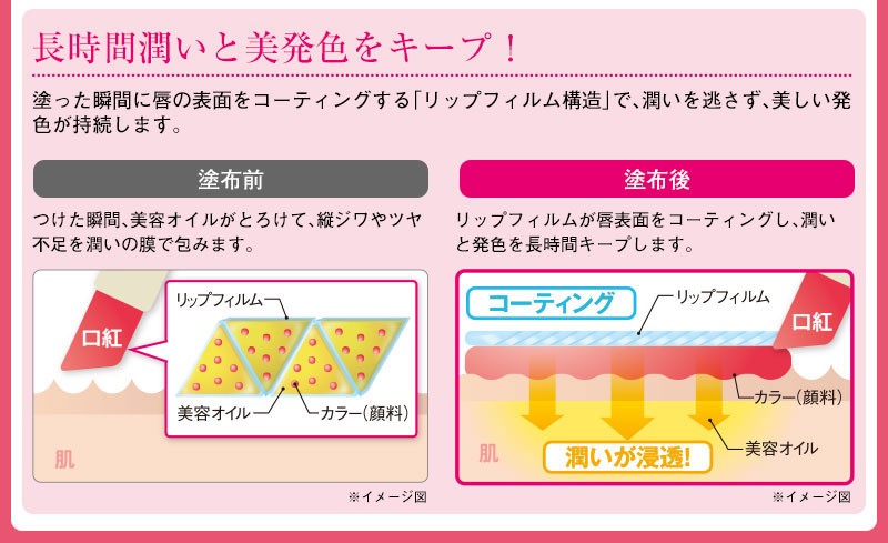 | ご使用上のご注意 | ●化粧品が肌に合わないとき、以下のような場合にはご使用をおやめください。 1.使用中、赤み、はれ、かゆみ、刺激などの異常があらわれた場合。 2.ご使用した唇に直射日光があたって上記のような異常があらわれた場合。 そのまま化粧品類のご使用を続けますと、症状を悪化させることがございますので、皮膚科専門医師等にご相談ください。 ●傷や湿疹、はれものなどの異常のあるところにはお使いにならないでください。 |