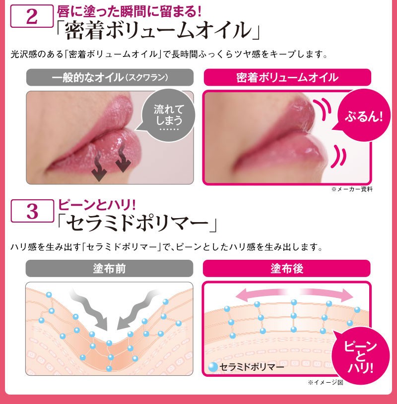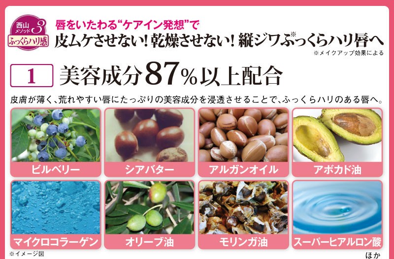 | 成分 | 【プレミアムピンク】 ポリブテン、トリエチルヘキサノイン、ミネラルオイル、パルミチン酸エチルヘキシル、リンゴ酸ジイソステアリル、合成ワックス、ダイマージリノール酸(フィトステリル/イソステアリル/セチル/ステアリル/ベヘニル)、ポリエチレン。ジイソステアリン酸グリセリル、(VP/ヘキサデセン)コポリマー、ラウロイルグルタミン酸ジ(フィトステリル/オクチルドデシル)、(水添ロジン/ジイソステアリン酸)グリセリル、アセチルヒアルロン酸Na、加水分解コラーゲン、ビルベリー種子油 、アルガニアスピノサ核油 、(モリンガ油/水添モリンガ油)エステルズ、オリーブ果実油、シア脂、アボカド油 、カニナバラ果実油、(メタクリル酸グリセリルアミドエチル/メタクリル酸ステアリル)コポリマー、ジパルミトイルヒドロキシプロリン、キャンデリラロウ、マイクロクリスタリンワックス、アルギン酸Na、炭酸Ca、シリカ、ジメチコン、グリセリン、水、BG、トコフェロール、マイカ、酸化チタン、水酸化Al、硫酸Ba、酸化鉄、赤202 【ソフトオレンジ】 ポリブテン、トリエチルヘキサノイン、ミネラルオイル、パルミチン酸エチルヘキシル、合成ワックス、リンゴ酸ジイソステアリル、ダイマージリノール酸(フィトステリル/イソステアリル/セチル/ステアリル/ベヘニル)、ポリエチレン、(VP/ヘキサデセン)コポリマー、シリカ、ラウロイルグルタミン酸ジ(フィトステリル/オクチルドデシル)、ジイソステアリン酸グリセリル、(水添ロジン/ジイソステアリン酸)グリセリル、アセチルヒアルロン酸Na、加水分解コラーゲン、ビルベリー種子油 、アルガニアスピノサ核油、(モリンガ油/水添モリンガ油)エステルズ、オリーブ果実油、シア脂、アボカド油、カニナバラ果実油、(メタクリル酸グリセリルアミドエチル/メタクリル酸ステアリル)コポリマー、ジパルミトイルヒドロキシプロリン、キャンデリラロウ、マイクロクリスタリンワックス、アルギン酸Na、炭酸Ca、ジメチコン、グリセリン、水、BG、トコフェロール、マイカ、酸化チタン、水酸化Al、硫酸Ba、酸化鉄、赤202 【モダンレッド】 トリエチルヘキサノイン、ポリブテン、ミネラルオイル、パルミチン酸エチルヘキシル、合成ワックス、ダイマージリノール酸(フィトステリル/イソステアリル/セチル/ステアリル/ベヘニル)、リンゴ酸ジイソステアリル、ポリエチレン、(VP/ヘキサデセン)コポリマー、ラウロイルグルタミン酸ジ(フィトステリル/オクチルドデシル)、ジイソステアリン酸グリセリル、(水添ロジン/ジイソステアリン酸)グリセリル、アセチルヒアルロン酸Na、加水分解コラーゲン、ビルベリー種子油 、アルガニアスピノサ核油(モリンガ油/水添モリンガ油)エステルズ、オリーブ果実油、シア脂、アボカド油、カニナバラ果実油、(メタクリル酸グリセリルアミドエチル/メタクリル酸ステアリル)コポリマー、ジパルミトイルヒドロキシプロリン、キャンデリラロウ、マイクロクリスタリンワックス、アルギン酸Na、炭酸Ca、シリカ、ジメチコン、グリセリン、水、BG、トコフェロール、マイカ、酸化チタン、水酸化Al、硫酸Ba、酸化鉄、赤202 |