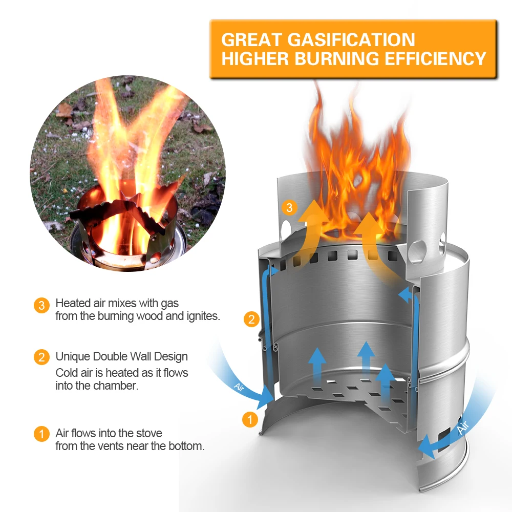 EFFICIENT BURNING, LESS SMOKE: The wood stove is designed with a simple yet scientific structure: Wide opening makes it easy to add wood; Double-wall structure creates a clean gasification and secondary combustion; Air vents near the bottom improve air circulation to help the fuel burn more completely with less smoke.