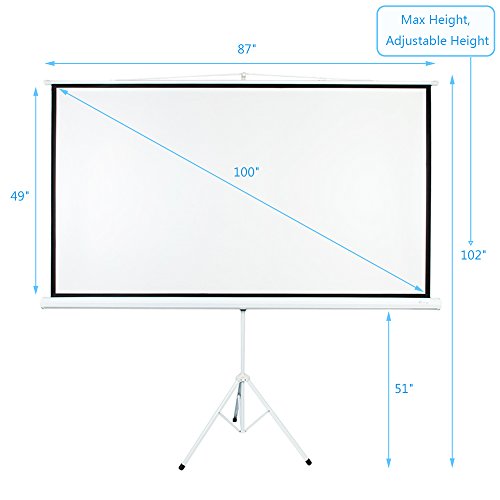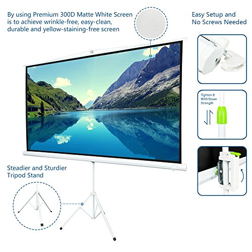 The brand, Showmaven, tripod projector screen endeavors to become an expert or maven in show, display field. US Stock, fast delivery. Shipping by USPS, FEDEX AND UPS. This tripod projector screen features perfect image effect, easy installation, lightweight, odorless, wrinkle-free, steady, durable. Because we are using 300D matte white screen fabric and high quality tripod stand instead of 150D screen that other sellers commonly use. Features: 1. Ideal for home theater movies, classroom training, conference room presentations, public display, etc. 2. Washable surface with water and keep clean 3. Portable steady tripod installation design, convenient for setting up 4. 16:9 screen format and diagonal 100" offers 87" x 49" viewing area 5. High contrast 1.3 gain screen optimizes picture quality 6. Matte white viewing surface diffuses projected light uniformly 7. 4-side black masking borders increase picture focus contrast 8. Black-backed screen material eliminates light penetration 9. Screen surface could wipe with mild soap or water 10. Lightweight steel white housing for easy installation Specifications: 1. Optical Technology: 1? 2. Operation Type: Tripod 3. Screen Fabric Color: Matte White 4. Viewing Area (W x H): 87" x 49" 5. Diagonal: 100" 6. Material: Steel PVC Fabric 7. Aspect Ratio: 16:9 8. Gain: 1:3 9. Viewing Angle: 160 Degrees Package Includes: 1 x 100" Tripod Projector Screen 1 x Instruction 1 x Tripod Stand 0 |