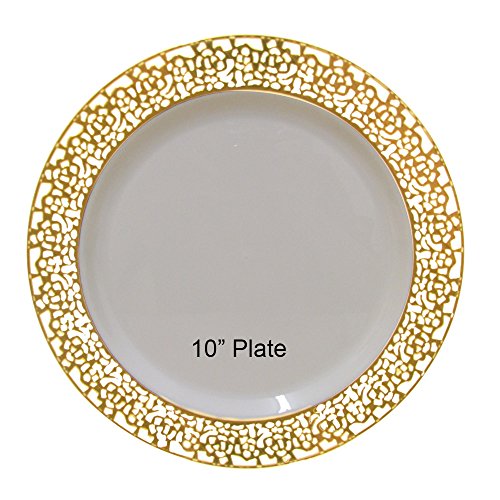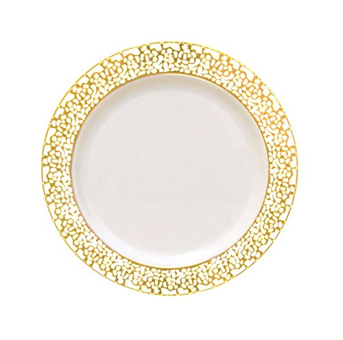 10 inch elegant and disposable ivory party plates trimmed with gold lace - set of 40.