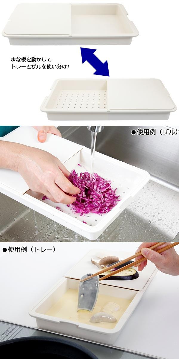 | 両面使用のまな板でトレーとザルを使い分け。切った後の野菜の皮などをスライドさせてトレーに移し集めておくことで、テンポよくお料理ができ、後の片付けも簡単です。ザルに移せばそのまま水切りできます。 |