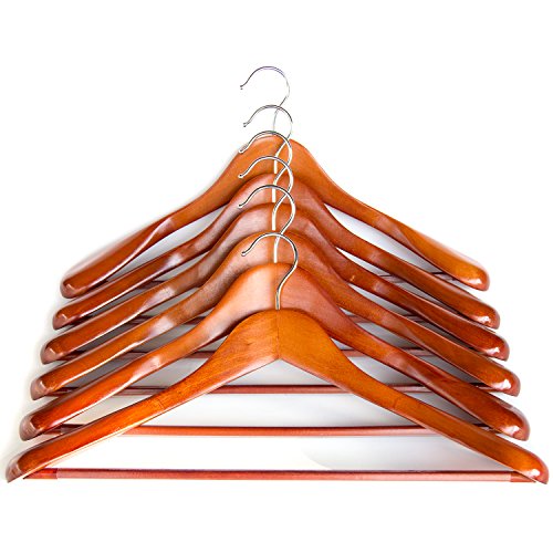 SET OF 6 WOOD SUIT HANGERS – Proudly display a professional wardrobe with luxury style and design with a securely packaged boxed set of premium finished cherry wooden suit hangers.