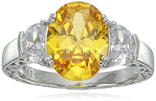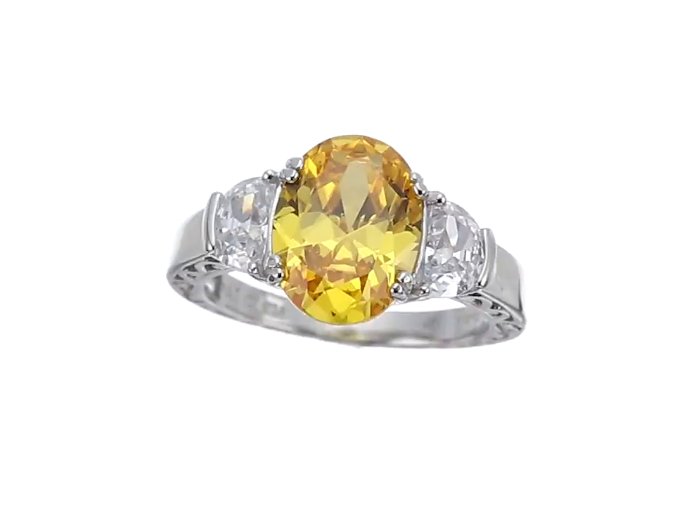 Rhodium Plated Sterling Silver Oval Yellow Cubic Zirconia 12x9mm and Crescent Shaped White Cubic Zirconia 6x4mm Ring, Size 7