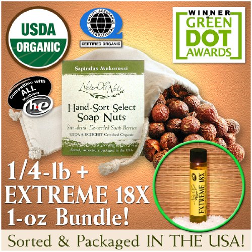 -. Feature : USDA CERTIFIED ORGANIC soap nuts / soap berries. - #1 brand in America! - Fresh, saponin-rich, wild-harvested, sun-dried Sapindus Mukorossi fruit from the Himalayas of India - NaturOli is an authorized Processor for the USDA National Organic Program (USDA NOP) - the ONLY official U.S. Organic Certification agency. - Processed in the USA! / + 18X BONUS! ($5.90 value) - ALSO INCLUDES: ONE (1) large 3-1/4" x 4-1/2" extra-heavy-duty muslin wash bag, plus 8-pages of info & instructions! - A 1oz bottle of EXTREME 18X soap nut liquid super-concentrate washes up to 12 loads. / USDA Certification assures of NO agricultural pesticides, industrial pollutants, commercial fertilizers, hazardous toxins, & chemical contamination. - U.S. lab tested safe from biological contagions. Stored in our climate-controlled, USDA inspected warehouses for ideal moisture content. / Order by NET weight. You can rely on weight while loads vary greatly. - Low sudsing. Perfect for high efficiency (HE) & front loading washers. Reduces need for fabric softeners & dryer sheets. Low cost per load! Soap nuts make doing laundry & home cleaning fun! - Find more products at our Amazon Brand Store: www.Amazon.com/NaturOli / A true organic laundry soap, natural detergent & all-purpose, green household cleaner. Hypoallergenic & fragrance free. Leaves laundry soft & clean. Works well for delicate fabrics. Excellent for cloth diapers.