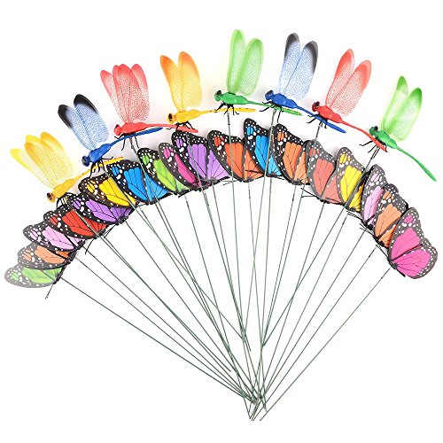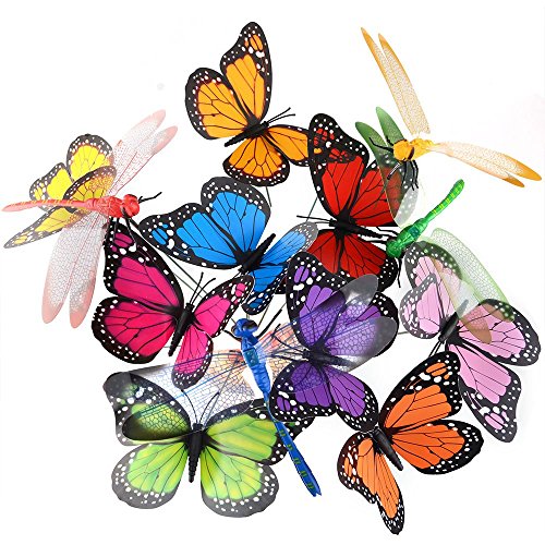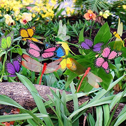 - 26 PCS in one set,include 18 Pcs Butterfly stakes(9 color,green, rose red, yellow, orange, purple, red, pink, blue and light orange, 2 pieces of each color) and 8 Pcs dragonfly stakes (4 color, red, yellow, blue, green,2 pieces of each color)