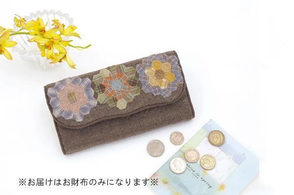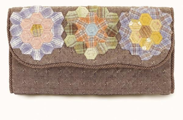 六角つなぎ(ヘキサゴン)がカラフルなお花に変身!縁取りのパイピング使いがオシャレなお財布が作れるキットです。通帳やカードが入り、ファスナーの付いたポケットも付いています。やわらかな陽射しの中にいるような優しい色合いは自然と心がなごみます。 |