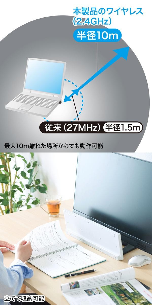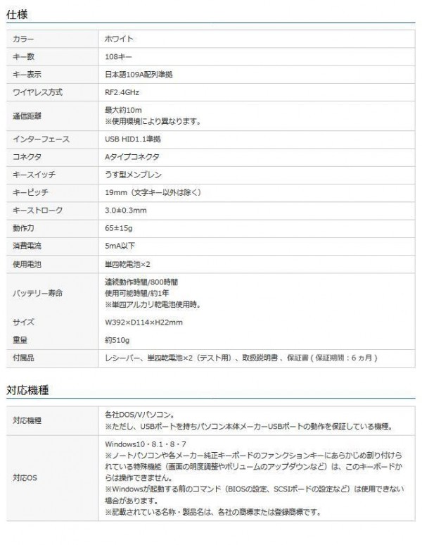 電波の到達距離の長い、周波数2.4GHzタイプで、最大10m離れた場所からでも動作可能です!隣合うキーを押しにくい「アイソレーション」タイプのキーボードで、誤入力を軽減します。テンキー付き、幅400mm以下のコンパクトサイズです。 |