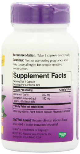 -. Binding : Health and Beauty -. Brand : Nature's Way -. Label : Nature's Way -. Manufacturer : Nature's Way -. PackageQuantity : 1 -. ProductGroup : Health and Beauty -. ProductTypeName : HEALTH_PERSONAL_CARE -. Publisher : Nature's Way -. Studio : Nature's Way -. Title : Nature's Way Cinnamon