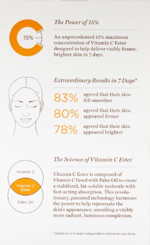 Vitamin C Ester 15 is scientifically formulated to help boost collagen production, smooth skin texture and dramatically brighten its appearance. Imperfections, fine lines, and wrinkles are diminished, redness is minimized and suppleness is restored, creating a visibly glowing, radiant complexion.Feature