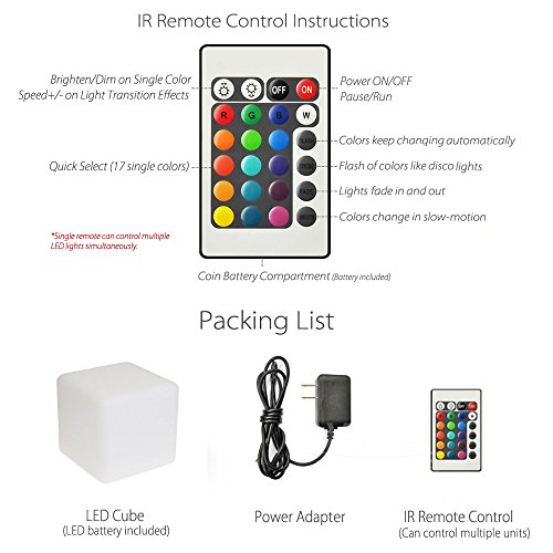 You'll be fascinated by the 16 different colors and 4 modes color changing LED lights inside the sturdy polyethylene cube. Set them to flash, strobe, fade, or smooth, and watch the multi-colored selection put on a great display. Choose one color or watch them all change for a fun look at your parties, special events or gatherings.