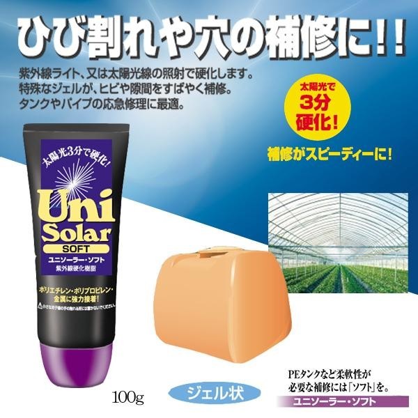 紫外線ライト、又は太陽光線の照射で硬化します。特殊なジェルがヒビや隙間を素早く補修。タンクやパイプの応急修理に最適です。